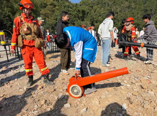 演练聚焦“实战”核心,科学设置了“器材实操”与“实战模拟”两大环节。在器材实操环节,防火队员围绕多种主力灭火装备开展了规范化操作演示。通过“手把手教学、点对点指导”的方式,邀请柳州职业技术大学师生进入操作区进行灭火机具操作体验,有效扩大了演练的辐射范围,普及了消防安全知识,进一步夯实了“预防为主、防消结合”的火灾防控基础。