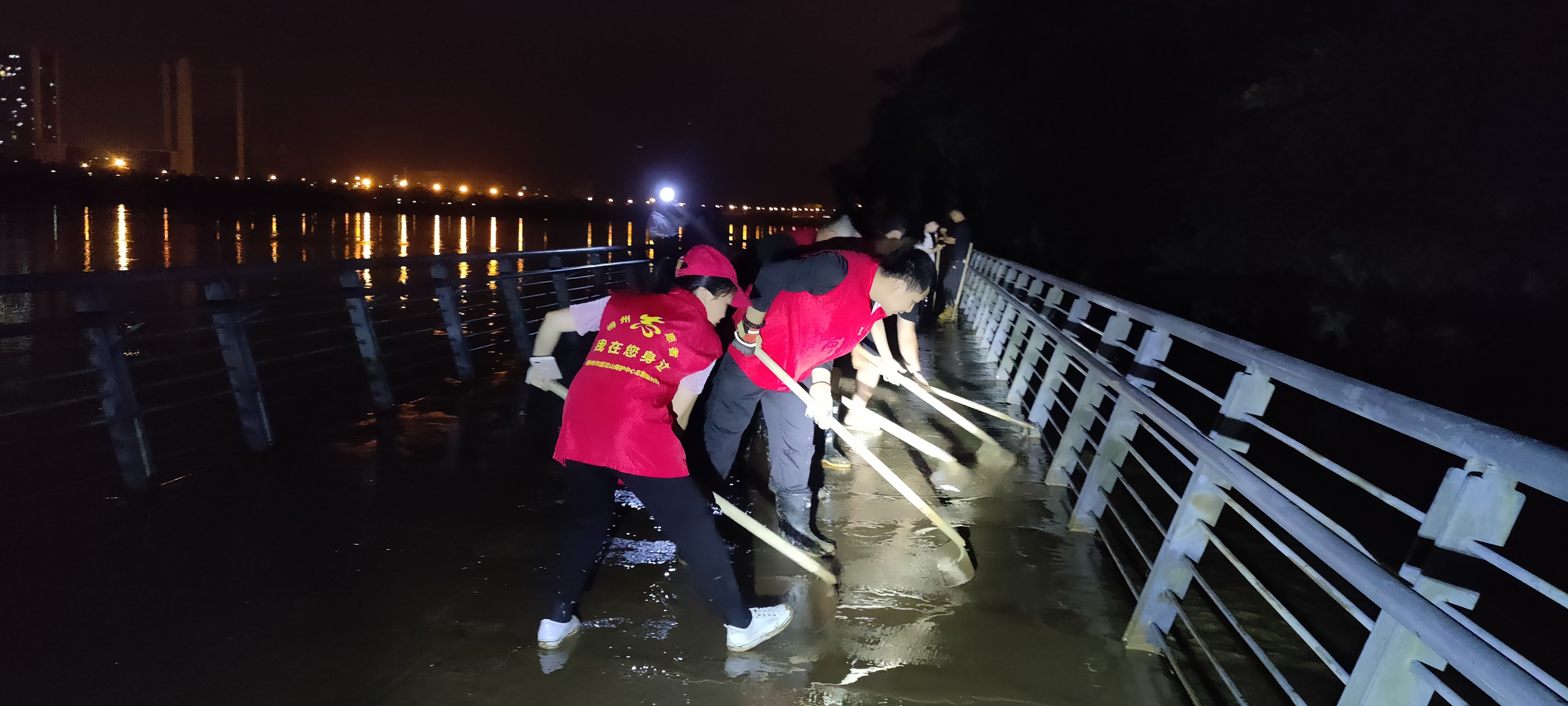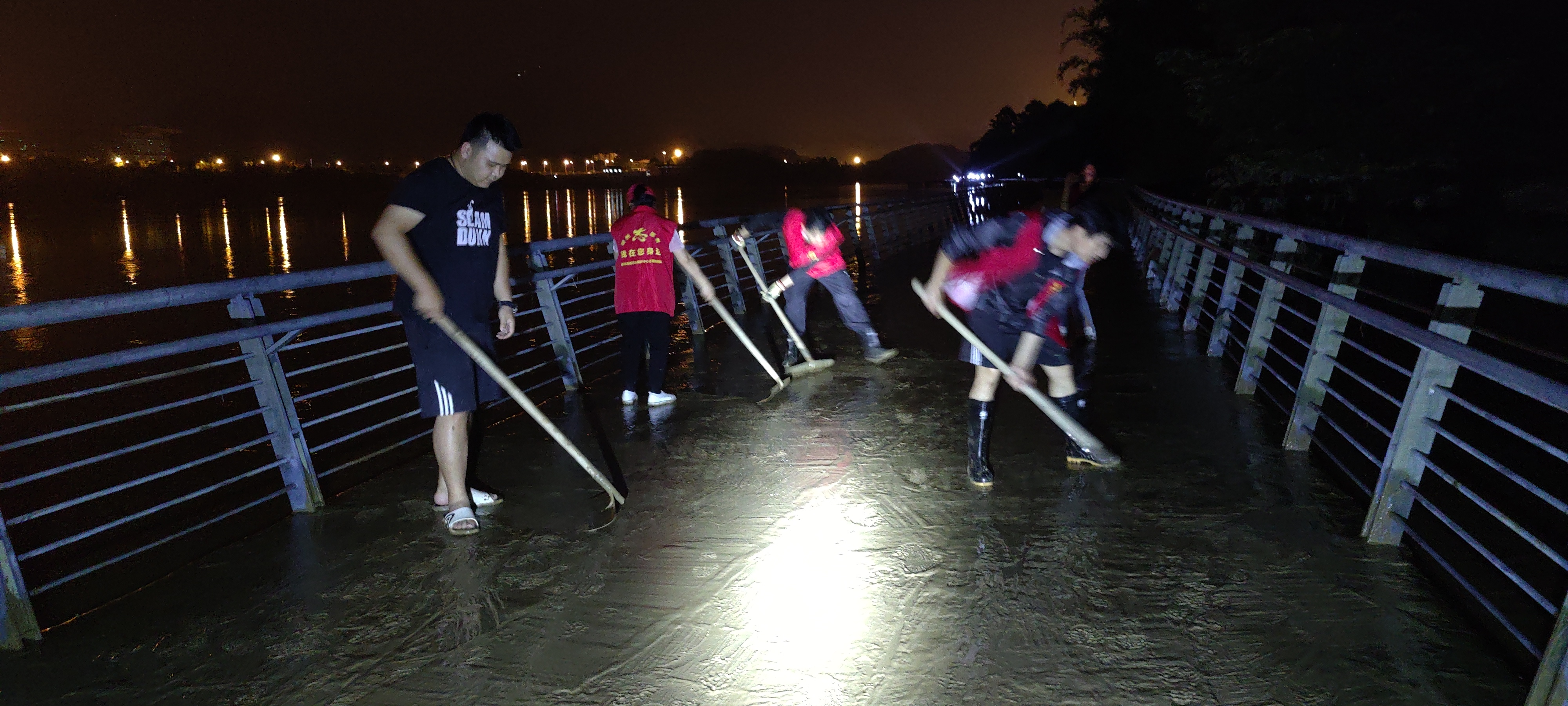 保护中心志愿队克服照明差、淤泥深等困难,拿着清淤铲作为“排头兵”先行清理较厚的淤泥和垃圾,经过连续5小时与华展社区干部并肩作战,环江滨水大道骑行道柳东村附近路段逐渐恢复原貌,充分展现了中心党员、团员不怕苦、不怕累、不怕脏的担当精神和“奉献、友爱、互助、进步”的志愿精神。