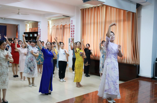 活动首先由旗袍礼仪导师蒋春花老师讲述旗袍的起源,并通过讲解和展演结合的方式介绍旗袍的舞韵美学、形体美学,让女职工们感受传统服饰里的精神风韵,感悟旗袍的文化传承。随后,蒋老师带领大家学习旗袍形态礼仪,进行美体拉伸,从肩、颈、手、臂、背、腰、臀、腿进行训练,让每位女职工雕琢更好的自己。展示环节,女职工们莲步轻移,娉娉婷婷,走、停、转、亮动作步态娴熟,曼妙多姿,尽显旗袍的古典之美和优雅之姿,更展现了女职工们健康自信的良好风貌。