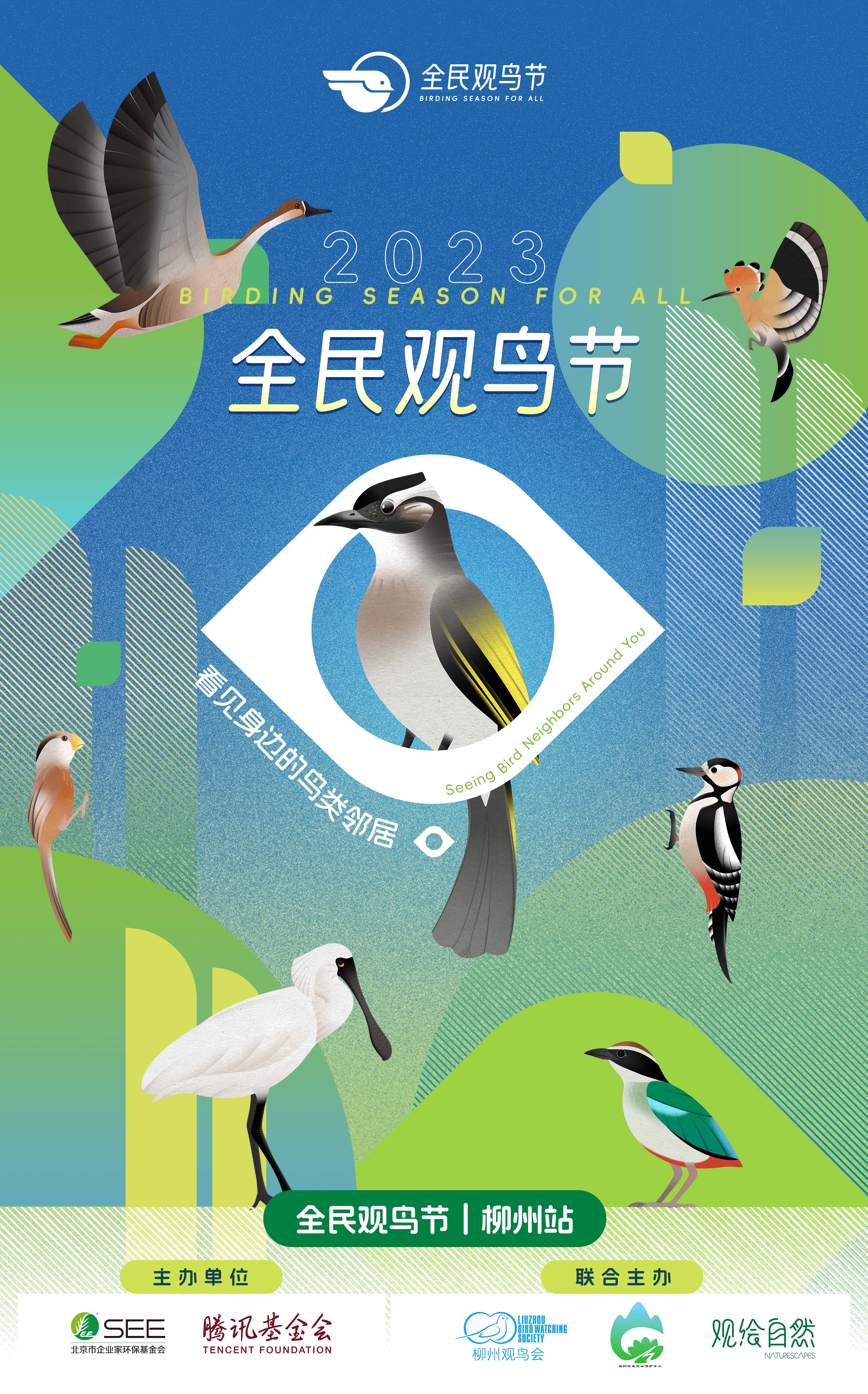 2023年全民观鸟节的主题为“看见身边的鸟类邻居”,以“城市常见鸟类”为切入点,带动更多人从识鸟、听鸟到观鸟。2023年全民观鸟节活动时间为9月下旬至12月底,活动期间将发布北京等十个城市的《观鸟指南》,指南内容包含十大城市鸟类及三大推荐观鸟地,同时在北京等三十多个城市举办展览、讲座、观鸟等多种多样的鸟类科普和观鸟实践活动。